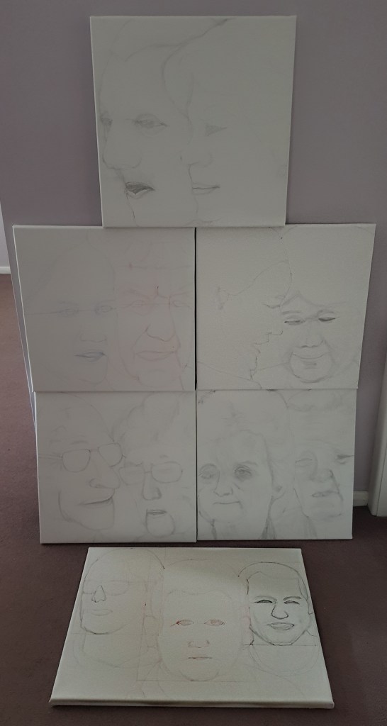 I realised that I was leaving long gaps in between painting sessions so that I could ponder the work and decided to prepare several canvases in advance: