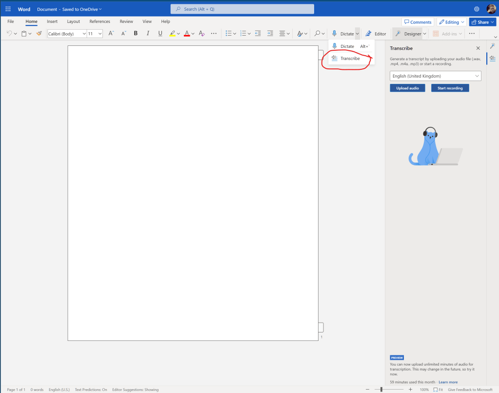 1. I recorded (on my phone) the conversation about my work and uploaded that to the web version of MS Word at Office 365 using the Dictate/Transcribe menu option: