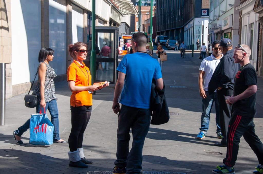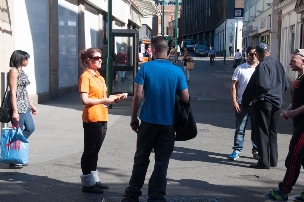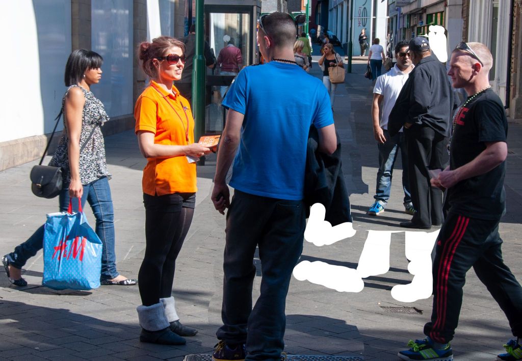 I then began looking at some photographs I’d taken in Nottingham about 10 years ago and chose a couple to work from. In both cases, I manipulated the photographs in Photoshop, moving people around and changing their sizes to create a composition that worked for me. I painted both on A2+ sized canvas boards (from Seawhite).